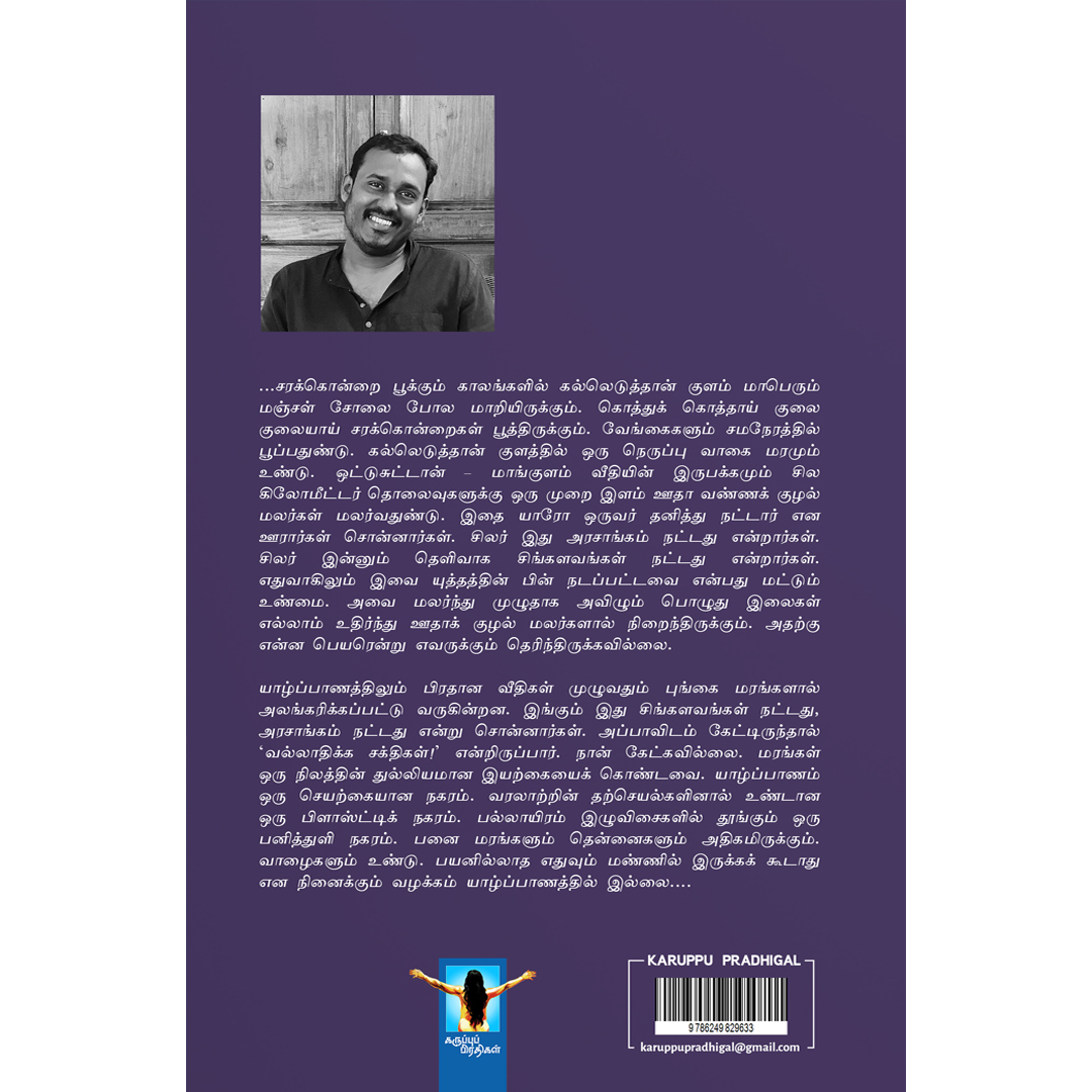 யாழ்ப்பாணத்திலும் பிரதான வீதிகள் முழுவதும் புங்கை மரங்களால் அலங்கரிக்கப்பட்டு வருகின்றன. இங்கும் இது சிங்களவங்கள் நட்டது. அரசாங்கம் நட்டது என்று சொன்னார்கள். அப்பாவிடம் கேட்டிருந்தால் ‘வல்லாதிக்க சக்திகள்!’ என்றிருப்பார். நான் கேட்கவில்லை. மரங்கள் ஒரு நிலத்தின் துல்லியமான இயற்கையைக் கொண்டவை. யாழ்ப்பாணம் ஒரு செயற்கையான நகரம். வரலாற்றின் தற்செயல்களினால் உண்டான ஒரு பிளாஸ்ட்டிக் நகரம். பல்லாயிரம் இழுவிசைகளில் தூங்கும் ஒரு பனித்துளி நகரம். பனை மரங்களும் தென்னைகளும் அதிகமிருக்கும். வாழைகளும் உண்டு. பயனில்லாத எதுவும் மண்ணில் இருக்கக் கூடாது என நினைக்கும் வழக்கம் யாழ்ப்பாணத்தில் இல்லை…
