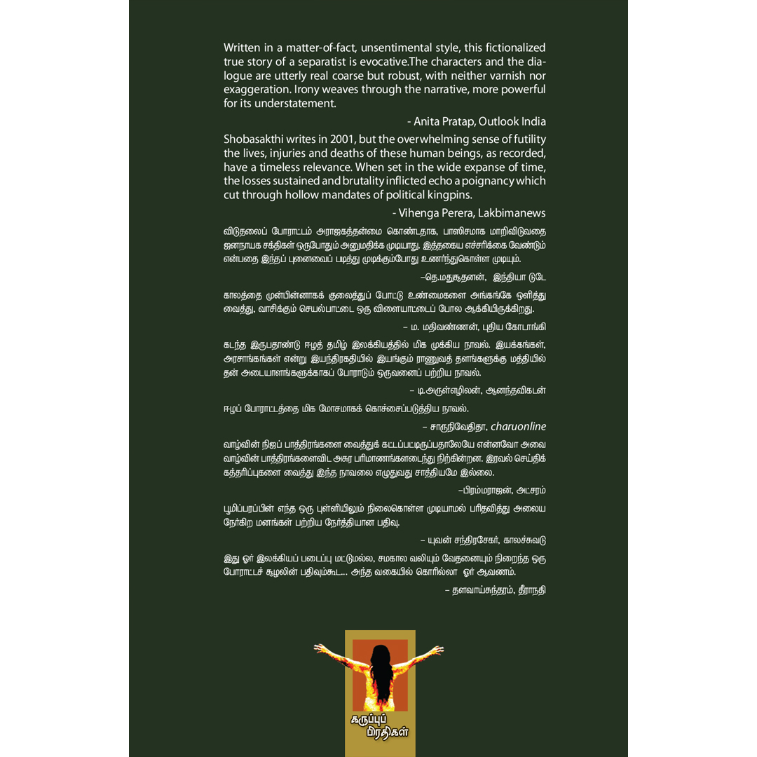 கடந்த இருபதாண்டு ஈழத் தமிழ் இலக்கியத்தில் மிக முக்கிய நாவல். இயக்கங்கள், அரசாங்கங்கள் என்று இயந்திரகதியில் இயங்கும் ராணுவத் தளங்களுக்கு மத்தியில் தன் அடையாளங்களுக்காகப் போராடும் ஒருவனைப் பற்றிய நாவல்.