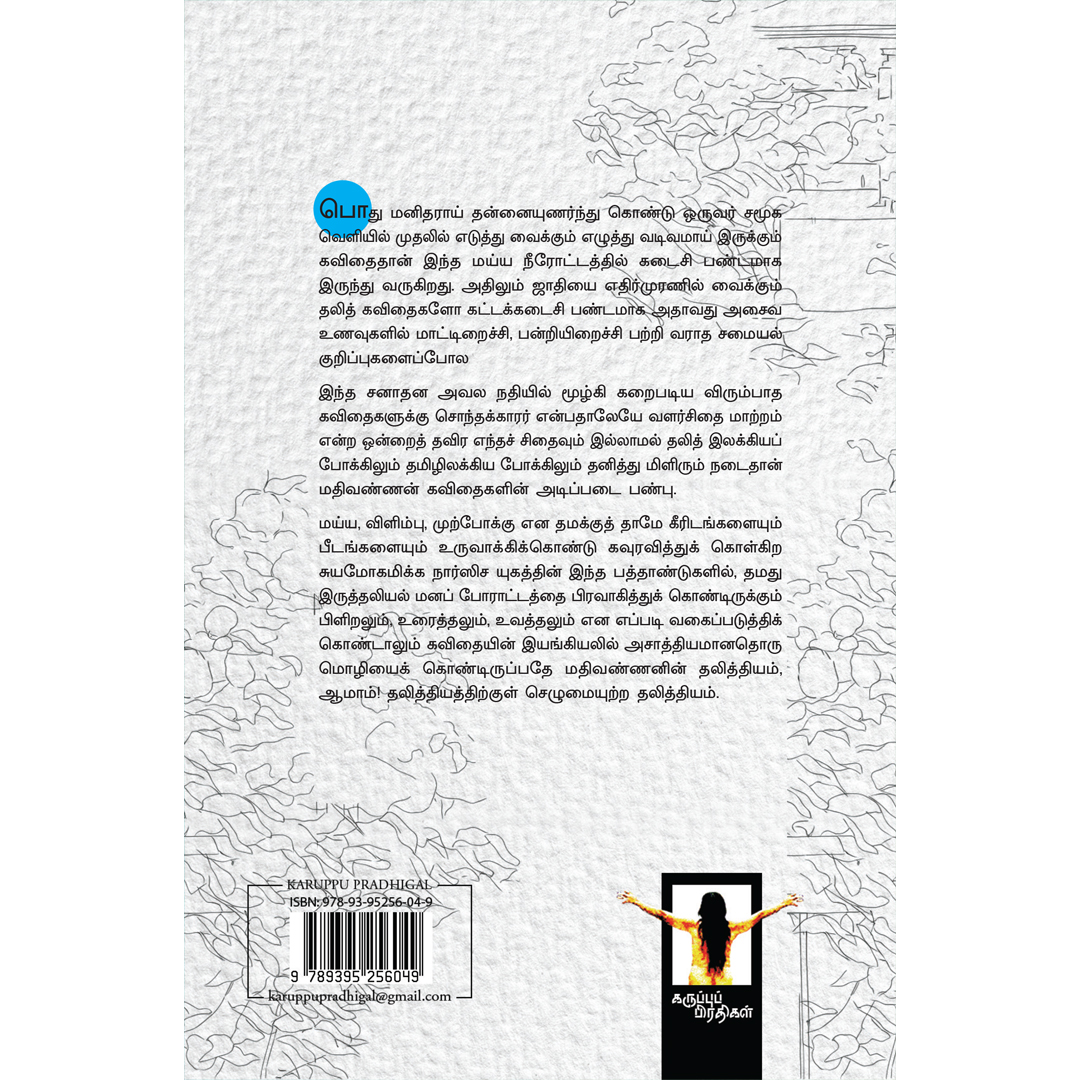 மய்ய, விளிம்பு, முற்போக்கு என தமக்குத் தாமே கீரிடங்களையும் பீடங்களையும் உருவாக்கிக் கொண்டு கவுரவித்துக் கொள்கிற சுயமோக மிக்க நார்ஸிச யுகத்தின் இந்தப் பத்தாண்டுகளில், தமது இருத்தலியல் மனப் போராட்டத்தை பிரவாகித்துக் கொண்டிருக்கும் பிளிறலும், உரைத்தலும், உவத்தலும் என எப்படி வகைப்படுத்திக் கொண்டாலும் கவிதையின் இயங்கியலில் அசாத்தியமானதொரு மொழியைக் கொண்டிருப்பதே மதிவண்ணனின் தலித்தியம், ஆமாம்! தலித்தியத்திற்குள் செழுமையுற்ற தலித்தியம்